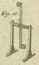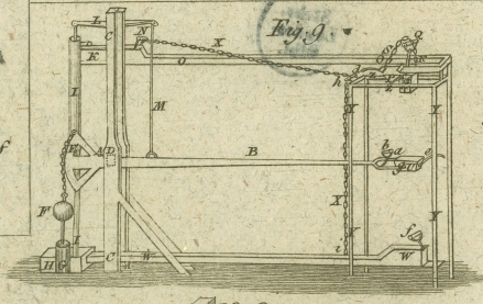 In Fig. 9. Tab. III. ist AB ein Hebel zwischen zwei Pfosten CC, der sich um seine Achse D dreht: die Laͤnge des kuͤrzern Armes A muß nach der Staͤrke des zu fuͤhrenden
