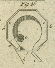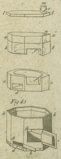 ist der untere Theil oder das Floͤz des Ofens, mit dem Aschenloche bei d, um die Luft durch den Rost e (Fig.