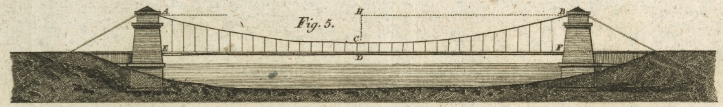 Die vorgeschlagene Bruͤke soll zwischen den Aufhaͤngepuncten, A und B, (Fig. 5), 400 Fuß lang