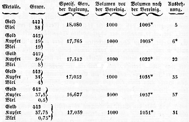Berechnung nach; Volumen vor der Vereinig.; Ausdehnung; Gold; Blei; Kupfer
