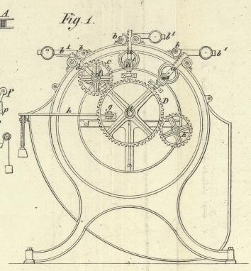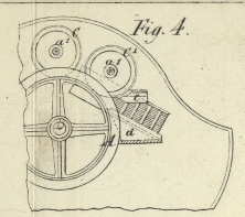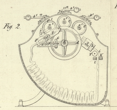 kleine Frictionsrollen die nöthige Führung. An der Welle des Cylinders C' befindet sich ein kleines Rad c, welches durch das Rad D in Umdrehung gesezt