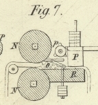nach einem Tisch R, wo es der Wirkung der Schläger P ausgesezt wird. Die Cylinder N,