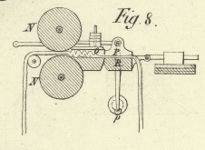 7 wird ein Hammer P durch einen Welldaumen p und in Fig. 8 der Hammer P durch ein Excentricum oder eine Kurbel p in Thätigkeit gesezt. Die Gewalt des Schlags kann