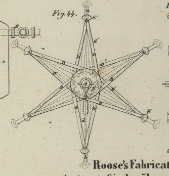 die kreisrunden Scheiben b, an welche die Stangen f befestigt sind, und seitwärts parallel zu ihnen
