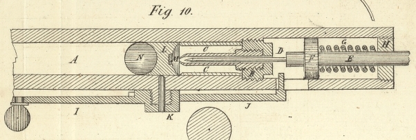 die Explosion der Zündmasse bewerkstelligt wird. Die Nadel ist mit dem Cylinder E verbunden, und dieser enthält eine Scheibe F von solchem Durchmesser, daß sie sich in dem