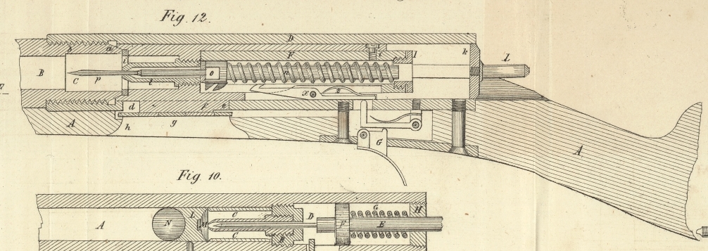 stellt den hinteren Theil dieses Gewehrs im Verticaldurchschnitt dar. A ist der Lauf, dessen Kaliber auf die letzten 2 1/2