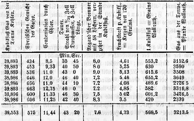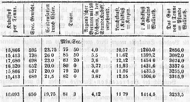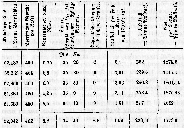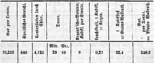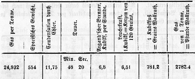 Der Durchschnitt dieser Versuche ergibt 1 Kubikfuß Gas = 11,79 Kerzen von 120 Grains,