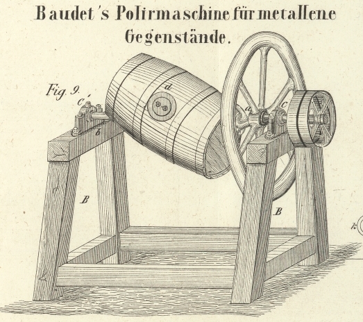 | Titel: | Ununterbrochen wirkende Polirmaschine für metallene Gegenstände; von Armand Baudet, Juwelier in Paris. |