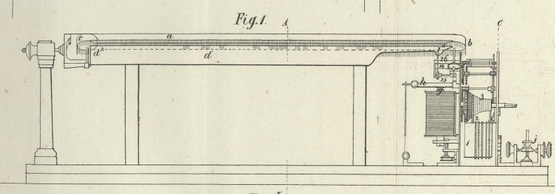 bleibt es unbeweglich, und die Franse an der einen Kante des Bandes a bewegt sich hinter der Schiene d. Wenn aber die Spitze d¹ der Schiene