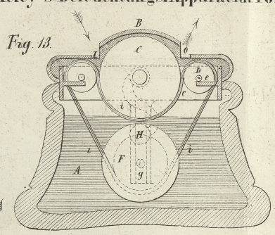 hervorkommt. Wenn das Wasser unter den Berührungspunkt der Walzen C und I hinabsinkt, so geht