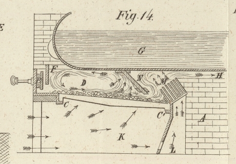 in Skizze die Gardner'sche Feueranlage (Patent Smokeless Furnace)Mechanic's Magazine. Vol. 63. Sept. 1855. pag. 289.