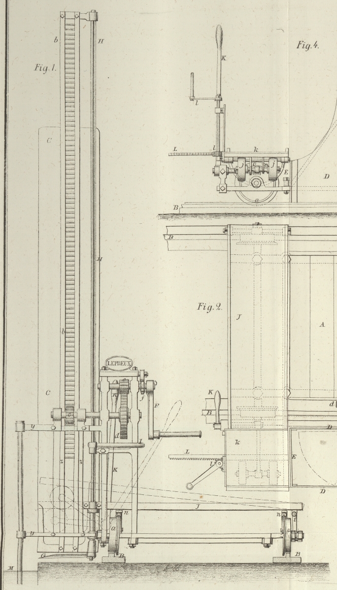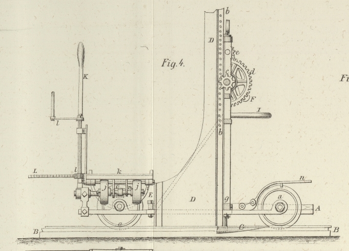 angebracht, deren letztes Getriebe in eine lange und starke, senkrechte Zahnstange