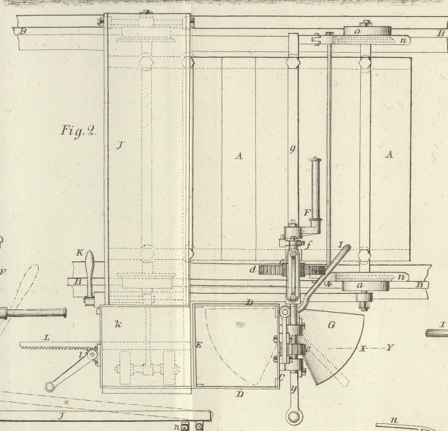 bewegliche Bret J aufhebt, indem er auf den Hebel K drückt, gleitet das Torfstück auf der geneigten Ebene
