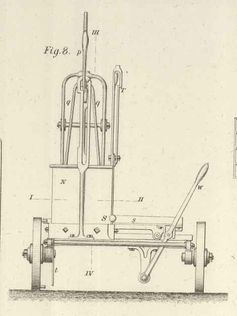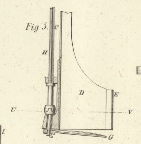in derselben senkrechten Ebene bewegen; zu dem Ende wird er in einer Coulisse r geführt, welche ihm am Ende seines Laufs am obern