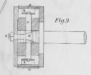 Der Dampf geht in der Richtung der Pfeile in die Scheibe e, durch die Canäle b in den Dampfcylinder,