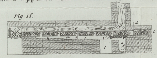 eines Flammofens besitzt. g ist der Feuerherd, c ist die aus Eisenplatten bestehende Sohle, unter