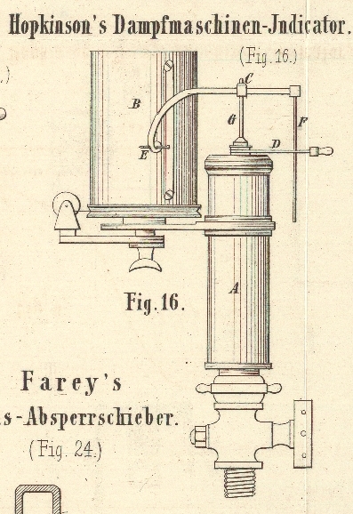 In der Skizze dieses Indicators Fig. 16 bezeichnet E den Schreibstift an einem mit der Kolbenstange G des Indicatorcylinders A