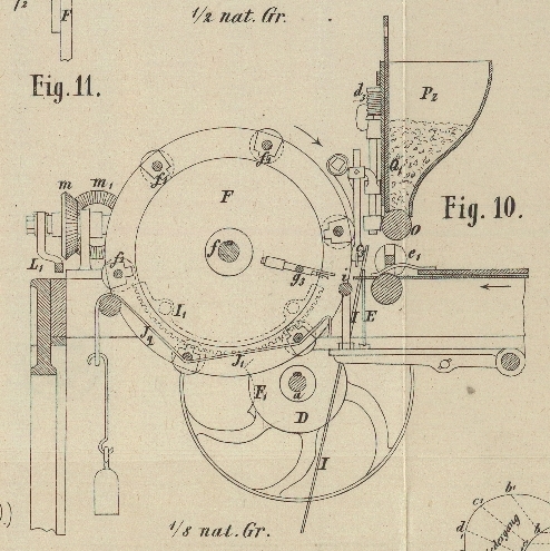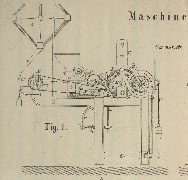 im Stande waren. Zum Betriebe von 6 solchen Maschinen war eine Pferdekraft erforderlich.Das Patent, welches Motsch am 24. Januar 1854