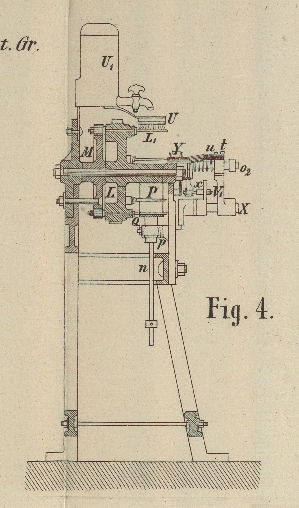 durch das Zahnrad der Scheibe L und ein auf X aufgekeiltes Getriebe in Umdrehung versetzt. Auf der