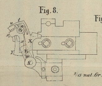 wieder ein, indem die Nase t seitlich des Rades s gegen den festen Anschlag u trifft. Dieser ist am Maschinengestell Y