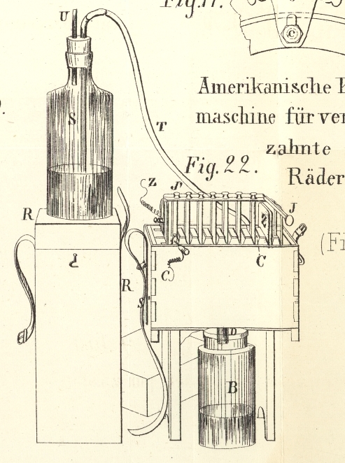 | Titel: | Ueber die galvanischen Säulen mit doppelt-chromsaurem Kali im Allgemeinen und die Systeme von Chutaux, Delaurier und Barker insbesondere; Bericht von du Moncel. |