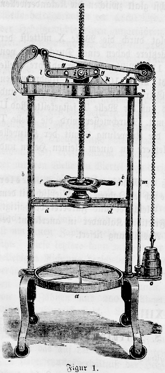 den Balken c; die Mutter h, in welcher sich die Schraube bewegt, liegt in einem einarmigen