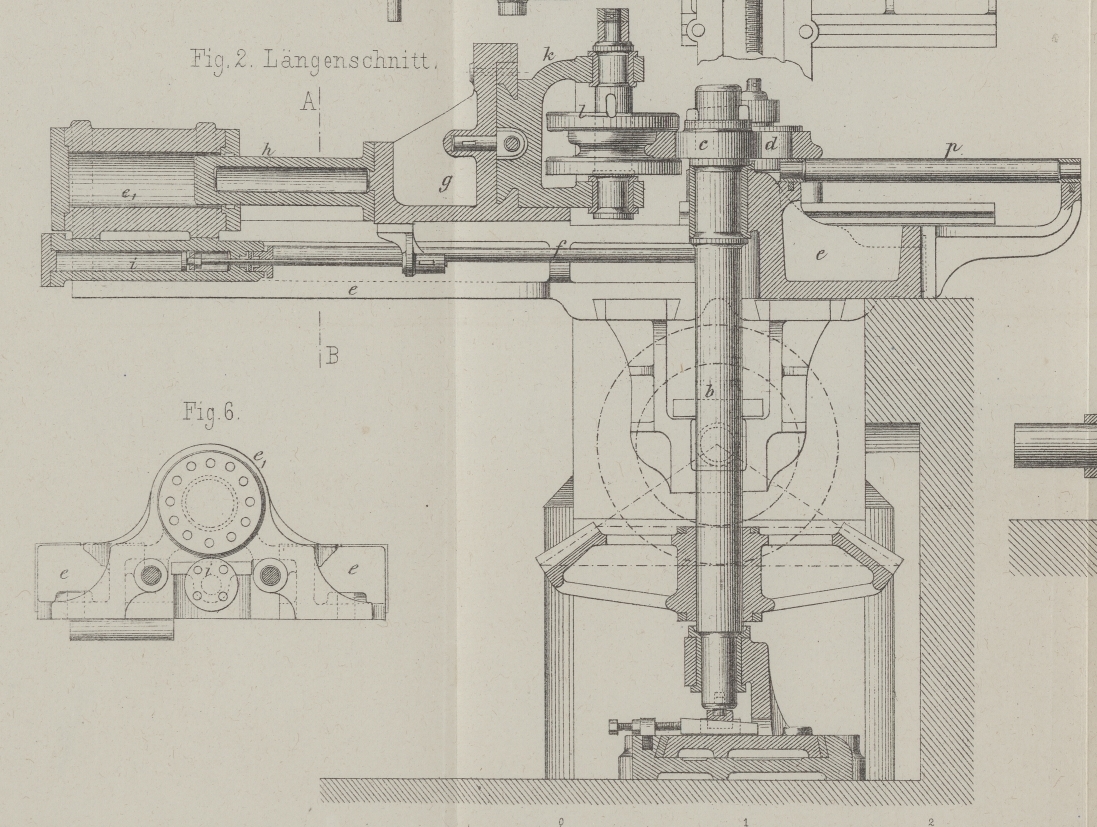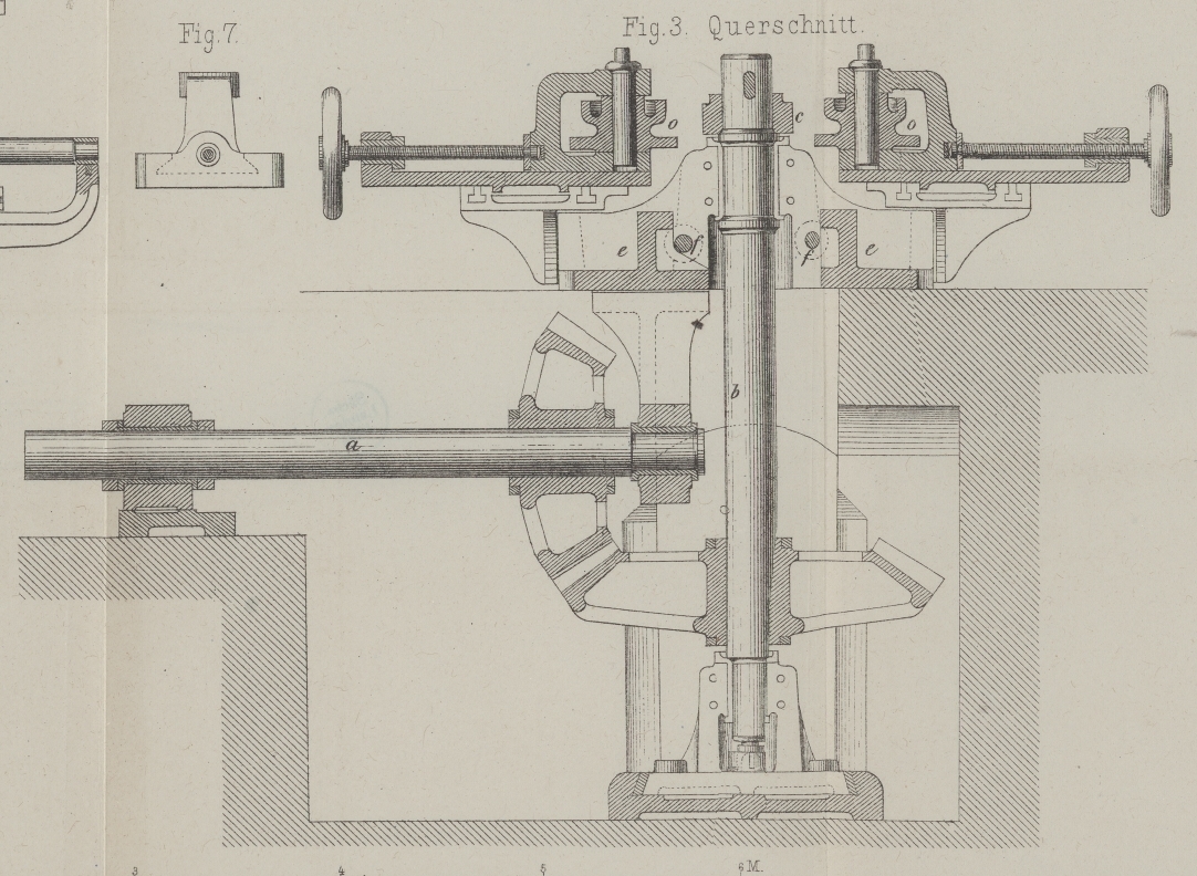 der Minute. Die Triebwelle der Dampfmaschine steht mit der Welle a in Verbindung, die ihre Bewegung durch conische Räder