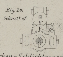 vor, bis endlich der Bund C an die Knagge D'' stößt, wodurch die Gabel D' ausgelöst wird und der Bohrapparat vermöge des Druckes der comprimirten