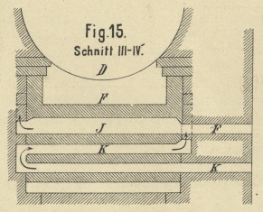 der Feuerbrücke gegenüber stehenden Stelle durch die düsenförmigen Oeffnungen i in den Verbrennungsraum und mischt sich dort mit den