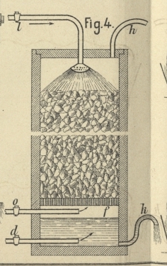 Thonkugeln oder Kokesstücken, über welche sich die durch das Rohr l zuflieſsende Bromlauge ergieſst. Durch das Rohr o wird Chlor und durch das Rohr d Wasserdampf zugeführt; die nicht absorbirbaren Gase entweichen durch das
