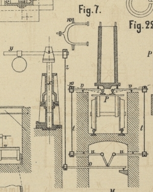 Zugstange z an. Diese hebt den einarmigen Hebel o, dadurch die auf denselben aufdrückenden Hebel w, die Zugstangen t werden