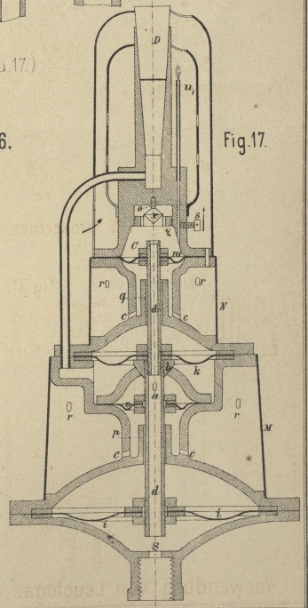 Gases auf die beiden Membranen k und i treibt dann aber die Röhre d so weit in die Höhe, bis die obere als Ventilsitz gestaltete Oeffnung an