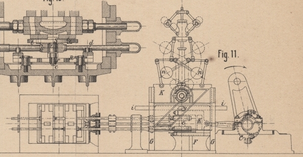 beiden Stangen der Expansionsplatten verbunden sind, und ein Zahnrad a, das in eine Zahnstange i eingreift und diese beim Hin- und Hergang des Schlittens mitnimmt. Die