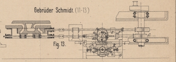 Zahnrades bewirkt, so hat man im Princip die Steuerung von Gebrüder Schmidt in Schwelm (Erloschenes * D. R. P. Nr. 8413 vom 5. August