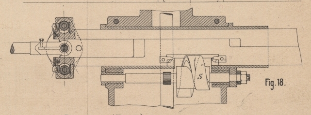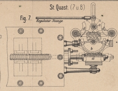 verbunden, in welches eine mit der Regulatorhülse verbundene Zahnstange F eingreift. Der Schraube S ist ein verhältniſsmäſsig groſser Durchmesser gegeben, um die zur