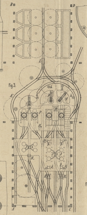 32) ist 284m lang und 30m tief. In dem Seitenflügel E sind die Gebläsemaschinen und Pumpen untergebracht. Die Zapfen