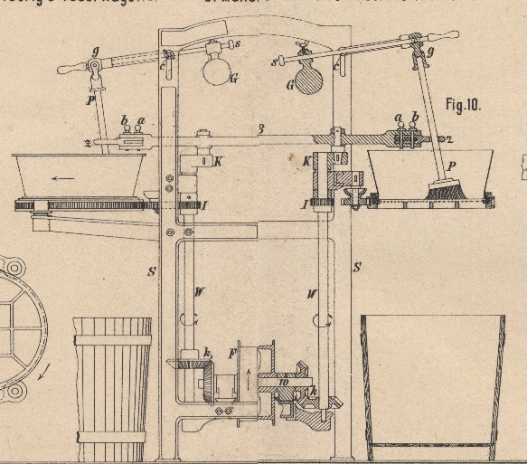werden. Die in Zargen eingespannten Siebe erhalten ebenfalls von der Welle W aus durch Zahnräder I