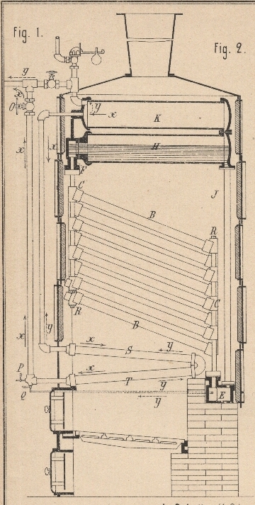 diese bilden dann einen Theil des Verdampfers. Durch den Hahn P kann man das Wasser aus S und T ablassen oder Dampf zur Untersuchung desselben