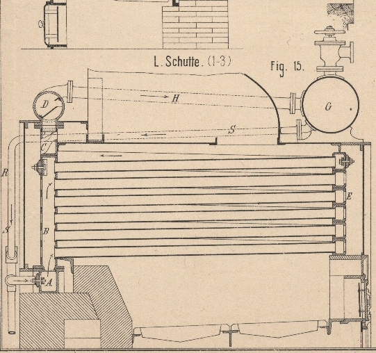 am hinteren Ende von H in einen Dampfsammler K, letzteres flieſst durch ein oder mehrere Röhren J nach dem Wasserkasten E