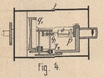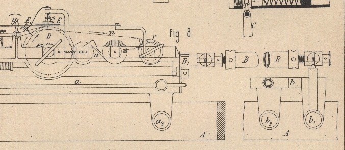 Der eine Pol der elektrischen Kette ist durch die Schleppfeder d mit der Welle A1 und dadurch mit dem Apparate selbst verbunden. Die