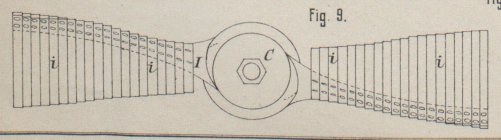 Muffe C sind starke Rippen I befestigt, auf denen der Gestalt der Schraube entsprechend Federn i angenietet sind. Wenn eine derartige Schraube