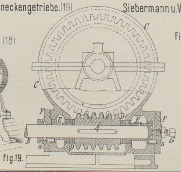 Das Schneckenrad wird von einem zweitheiligen Gehäuse C eingeschlossen, dessen unterer Theil auch die