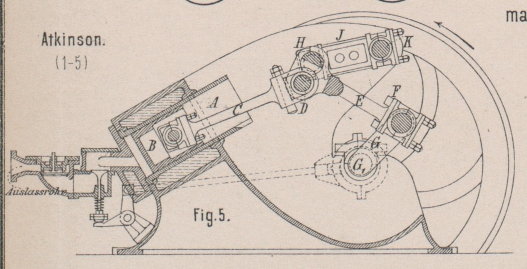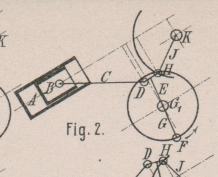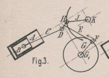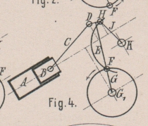 3 und 4) einen günstigeren Winkel für dessen Wirkung auf die Kurbelstange C zu erreichen. Die Inhalte zwischen Kolben und
