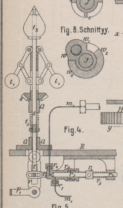 Gestänge r gleitende Klotz kann mittels der Spindel t gehoben und gesenkt werden, welch letztere unter der