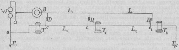 Denkt man sich die für den angegebenen Zweck angewendeten Erdleitungen E1 und E2 weg, so erscheint