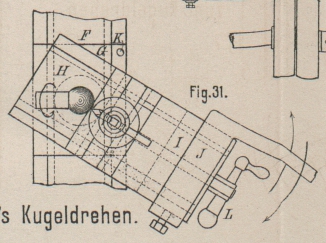 eingespannte Schneidstahl vermöge der Schraubenspindel L an die Kugel angeführt, während mit dem angeklemmten Hebel J der Supportdrehtheil H