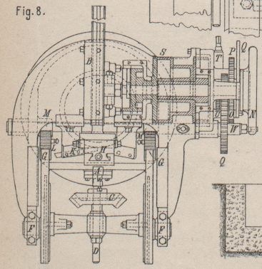 Zahnrad Q sitzt, welches das Getriebe M und dadurch die Zahnbögen G bethätigt.