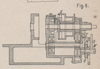 Das mit Rädervorgelege ausgestattete Triebwerk (Fig. 8 und 9) bethätigt mittels einer