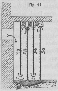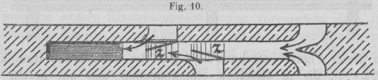 Die Luft muſs hierbei in mehrfach abgelenkter Bewegungsrichtung (vgl. die Pfeile in