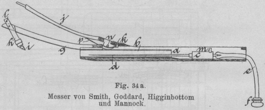 Textabbildung Bd. 294, S. 130Fig. 34a. Messer von Smith, Goddard, Higginbottom und Mannock. Das in Fig. 34 und 34a wiedergegebene Messer, dessen Construction von Smith, Goddard, Higginbottom und Mannock herrührt, ist zu diesem Zweck mit einer Klinge
